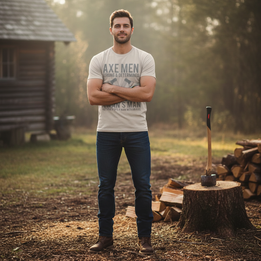 Built from soft Airlume combed and ring-spun cotton, this lightweight tee feels worn-in from the first wear. The front features bold, vintage-inspired typography and crossed axes that read “AXE MEN — STRONG & DETERMINED,” a graphic that channels workshop grit and outdoors know-how without shouting. Cut with a retail crew neckline and side seams for shape retention, the shirt layers easily under flannels or stands alone on a warm afternoon. The ribbed collar, shoulder tape, and tear-away label keep it comfortable through long days of work, weekend projects, or relaxed evenings by the fire. REACH-certified materials and ethically produced blanks add a quiet confidence to the piece — wear it when you want clothing that looks rugged but feels thoughtful.