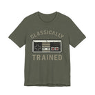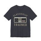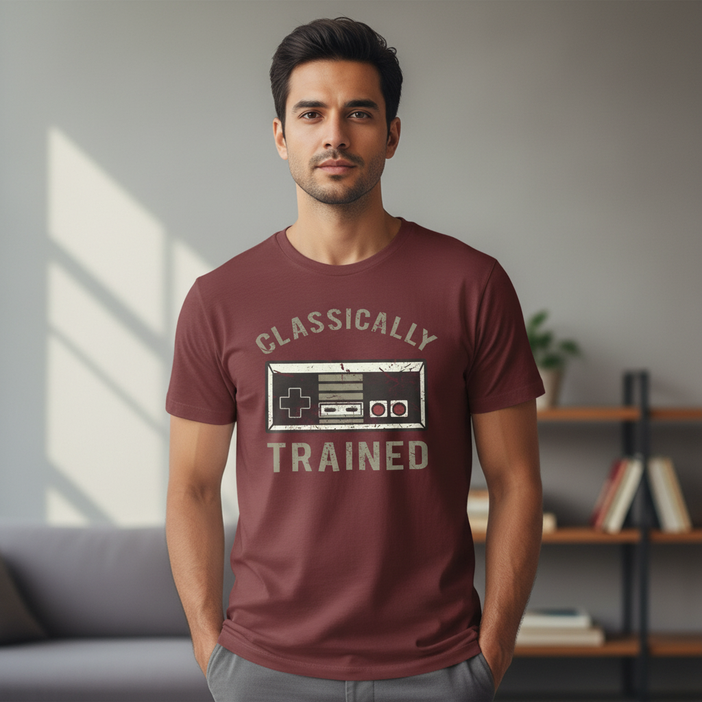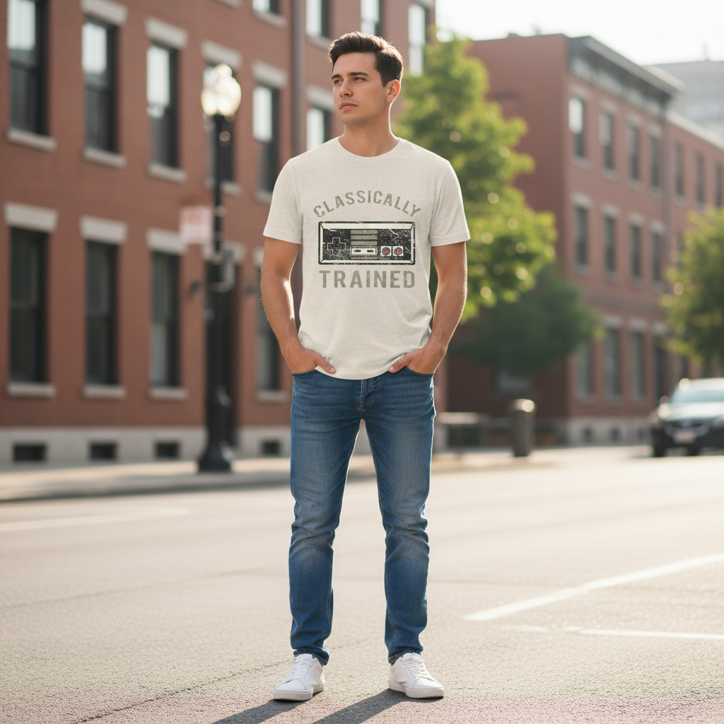 A lightweight, vintage-style tee that wears like a memory. The soft Airlume combed cotton feels breathable and broken-in from the first wear, while the distressed retro console graphic and “Classically Trained” lettering bring a warm, nostalgic tone. Side seams and shoulder tape keep the shape through repeated washes. The crew neckline sits neatly for easy layering under jackets or over long-sleeve shirts. Ethically made, REACH certified, and finished with a tear-away label for comfort — this shirt slips into the rhythm of everyday life, whether you're digging through old cartridges, hosting a low-key game night, or wandering a record store on a slow afternoon.