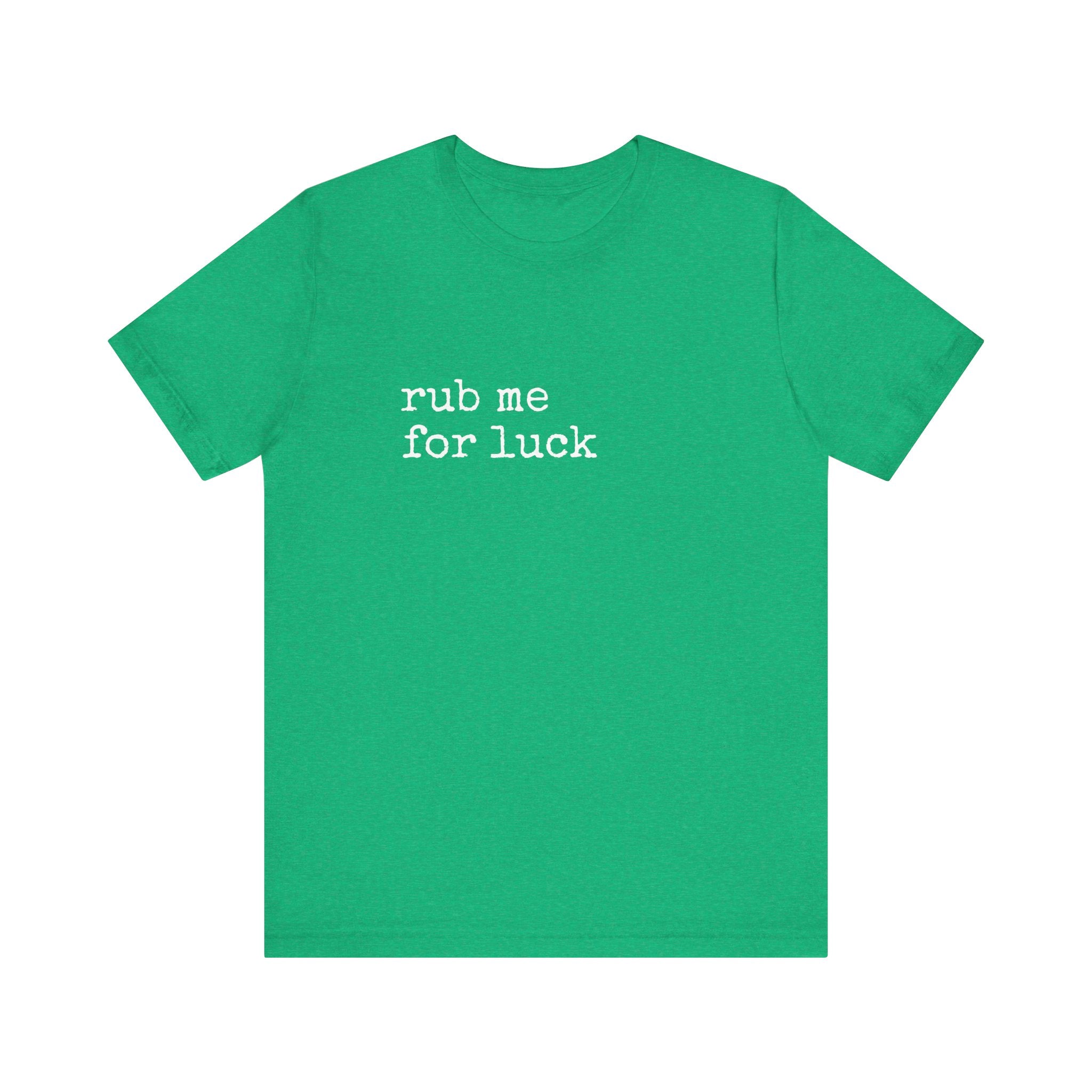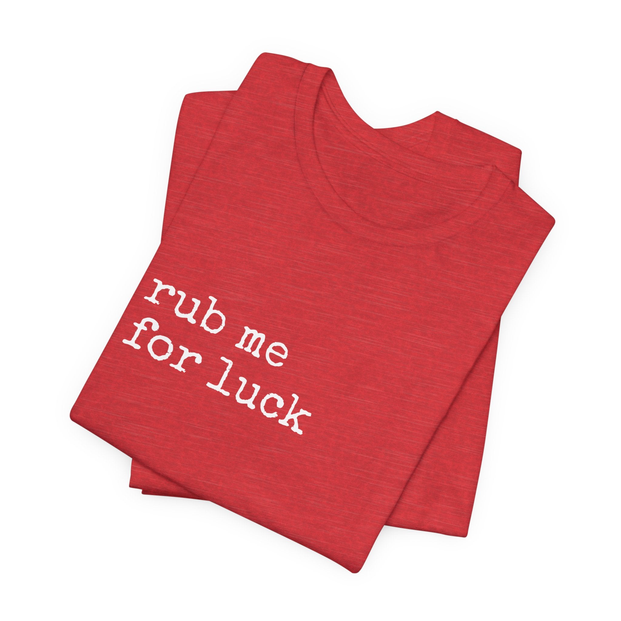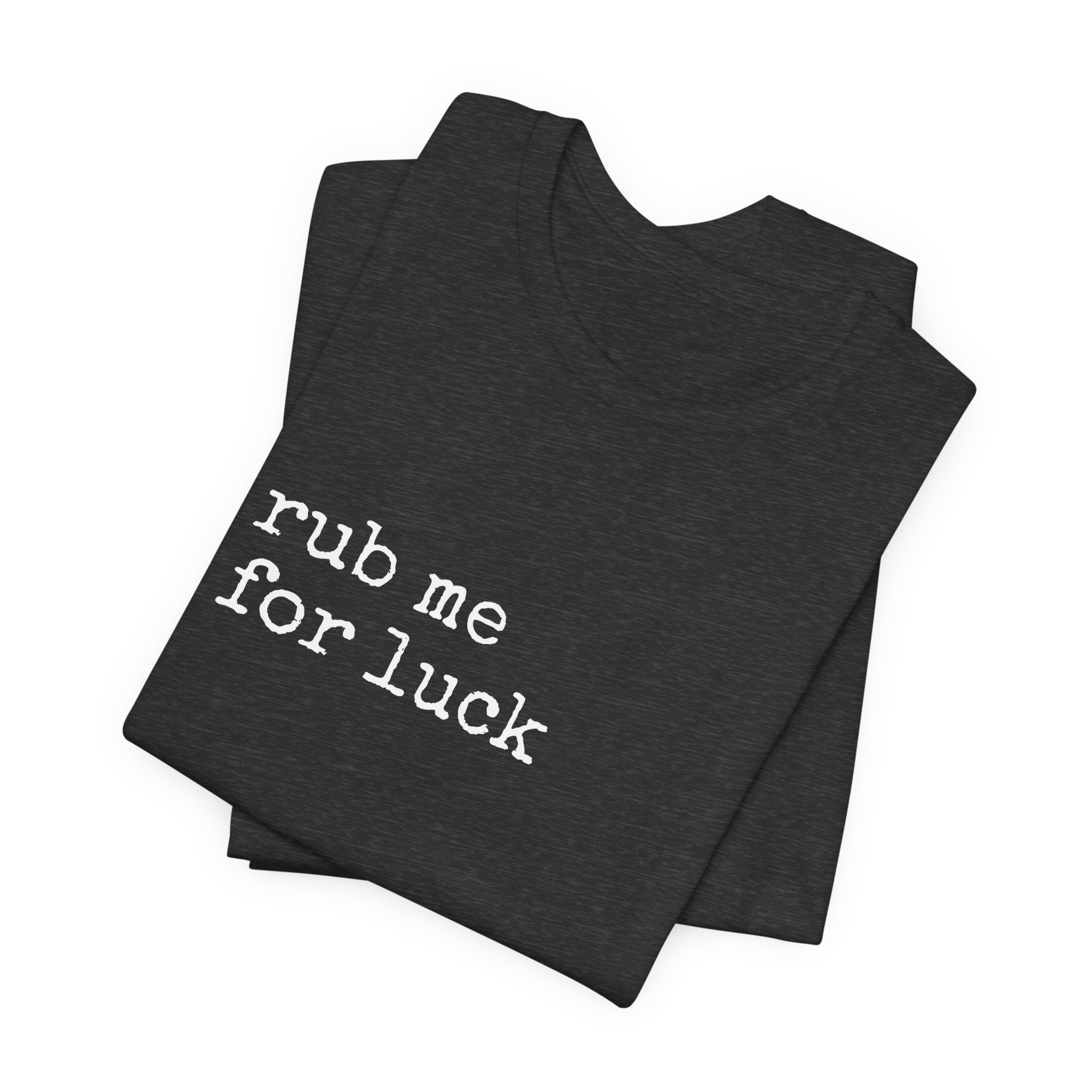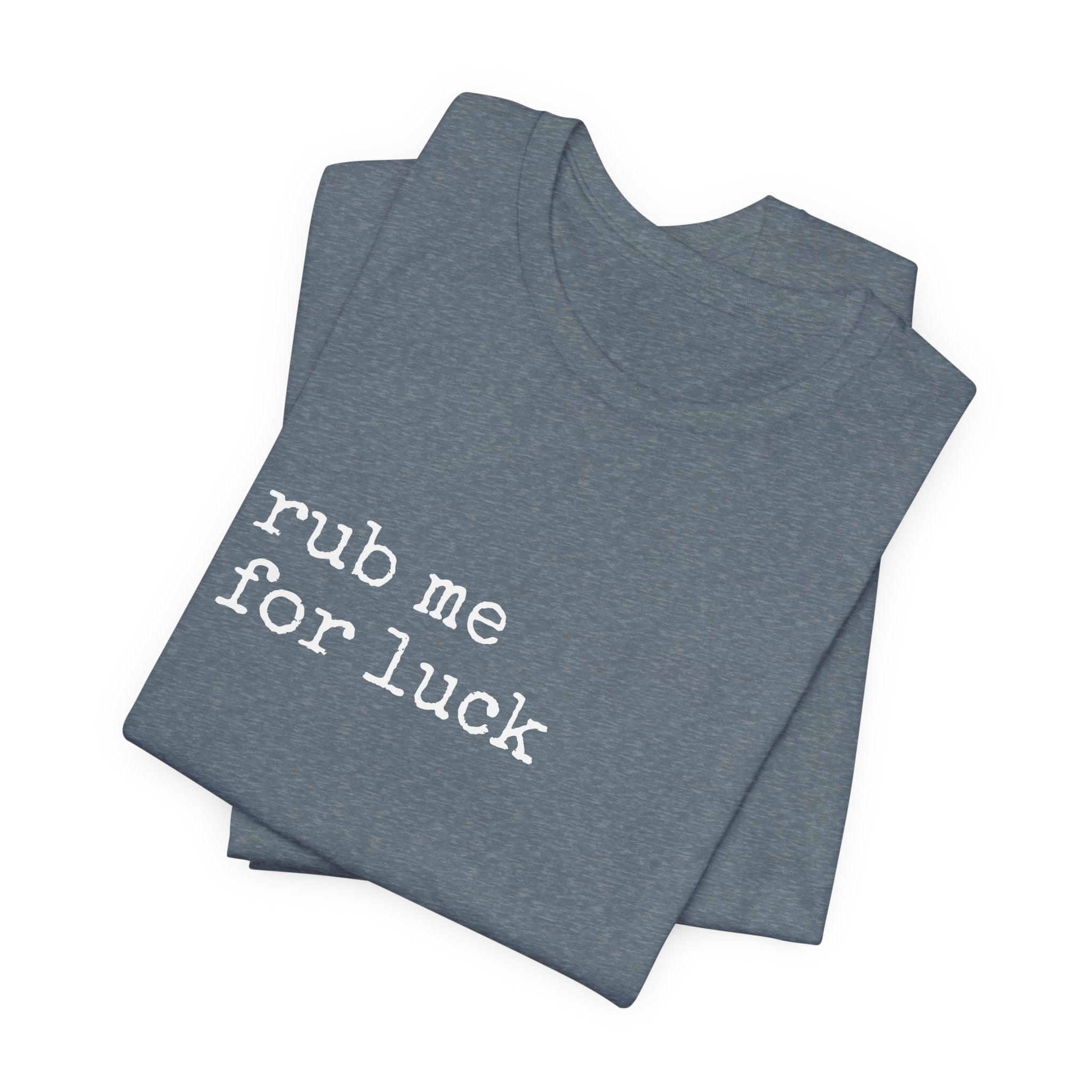 Soft, lived-in, and quietly cheeky — this lightweight jersey tee reads “rub me for luck” in a simple, typewriter-style font that feels like a private joke shared between friends. The Airlume combed and ring-spun cotton drapes gently, breathes easily, and layers without bulk. Side seams and shoulder tape keep the shape through frequent wear, while the ribbed crew neck holds its frame after washing. Wear it on lazy mornings, at coffee shops, or out with a low-key group of friends who appreciate dry humor and easy comfort. The muted heather color gives the shirt a worn-in warmth that complements denim, joggers, or your favorite cardigan.