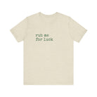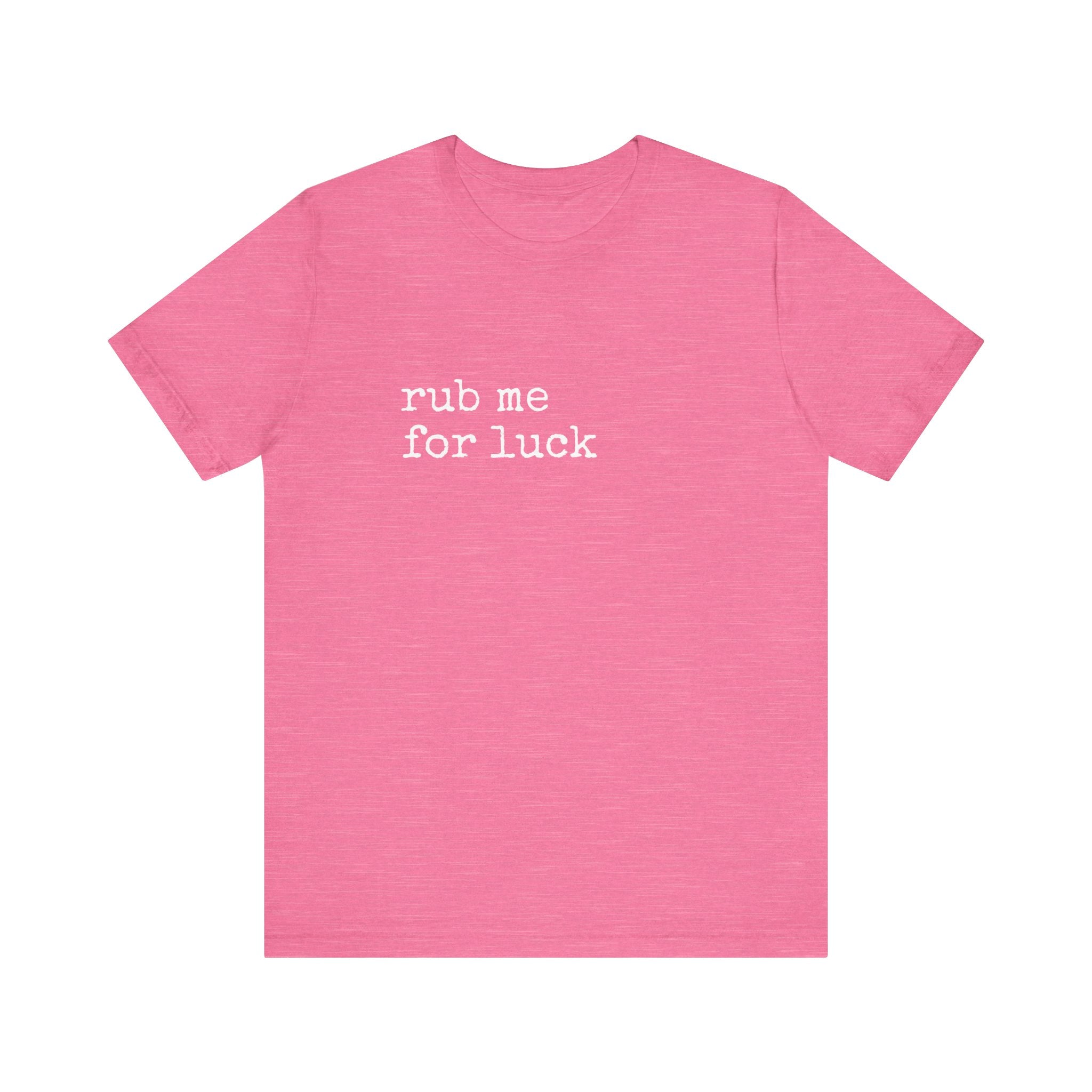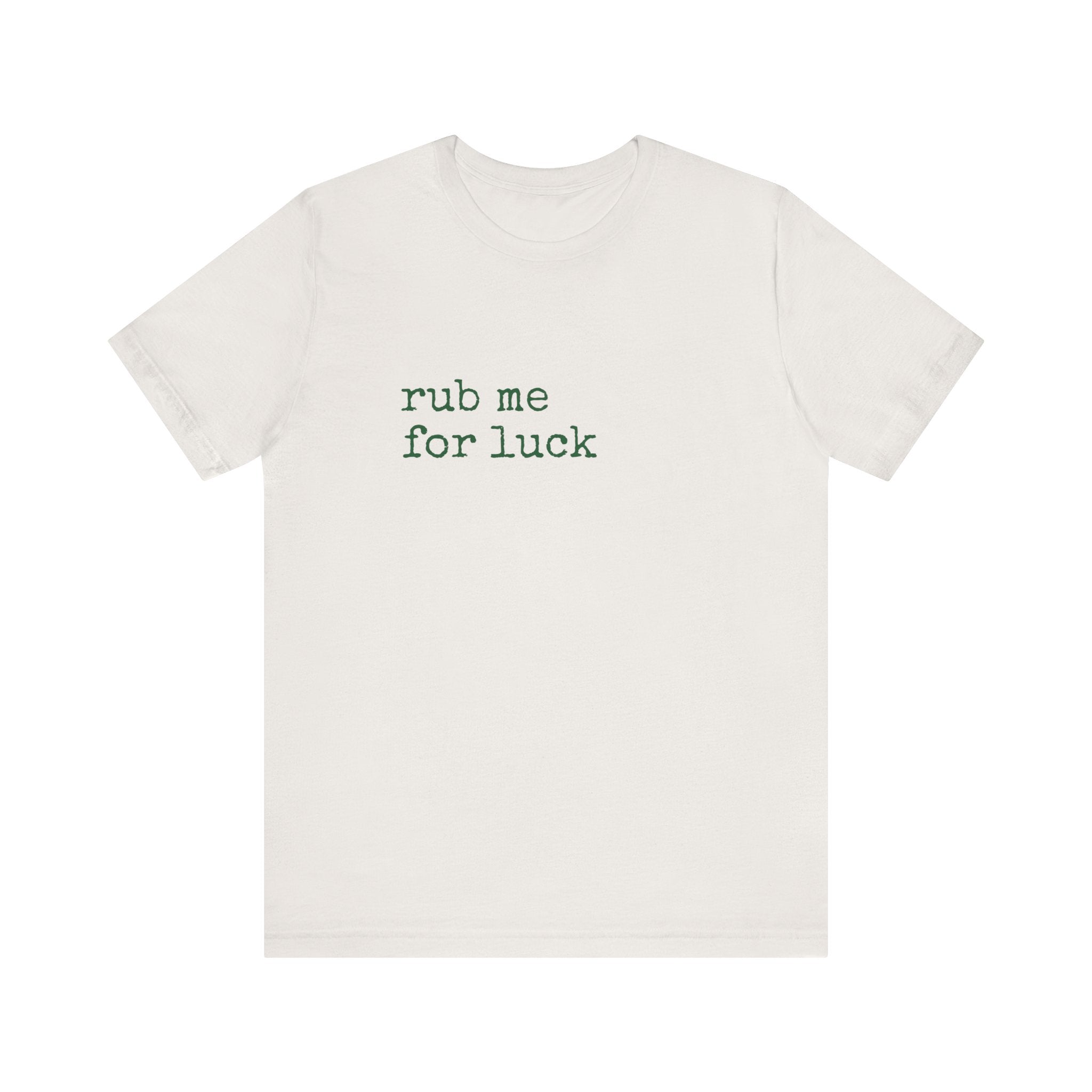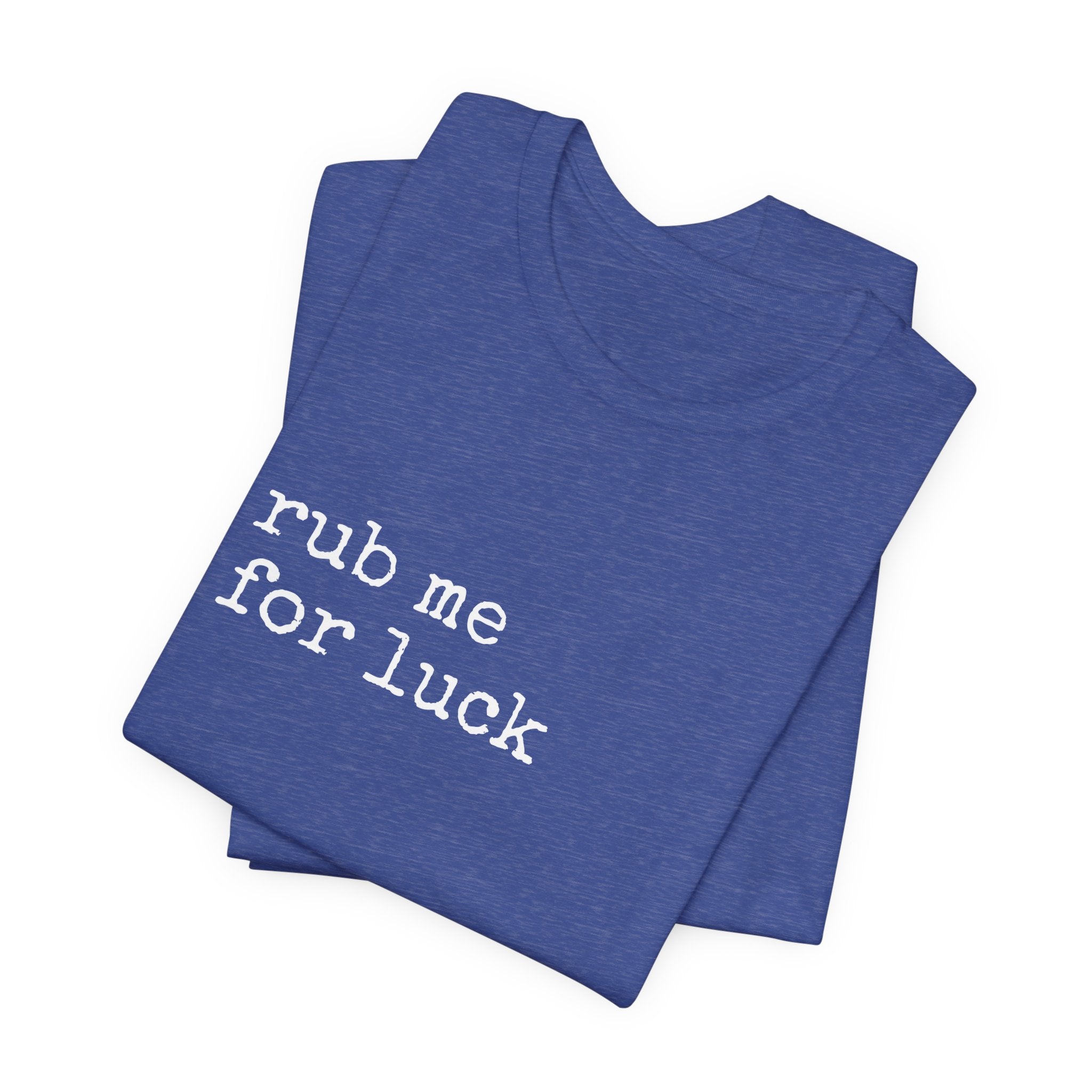 Soft, lived-in, and quietly cheeky — this lightweight jersey tee reads “rub me for luck” in a simple, typewriter-style font that feels like a private joke shared between friends. The Airlume combed and ring-spun cotton drapes gently, breathes easily, and layers without bulk. Side seams and shoulder tape keep the shape through frequent wear, while the ribbed crew neck holds its frame after washing. Wear it on lazy mornings, at coffee shops, or out with a low-key group of friends who appreciate dry humor and easy comfort. The muted heather color gives the shirt a worn-in warmth that complements denim, joggers, or your favorite cardigan.