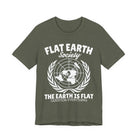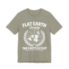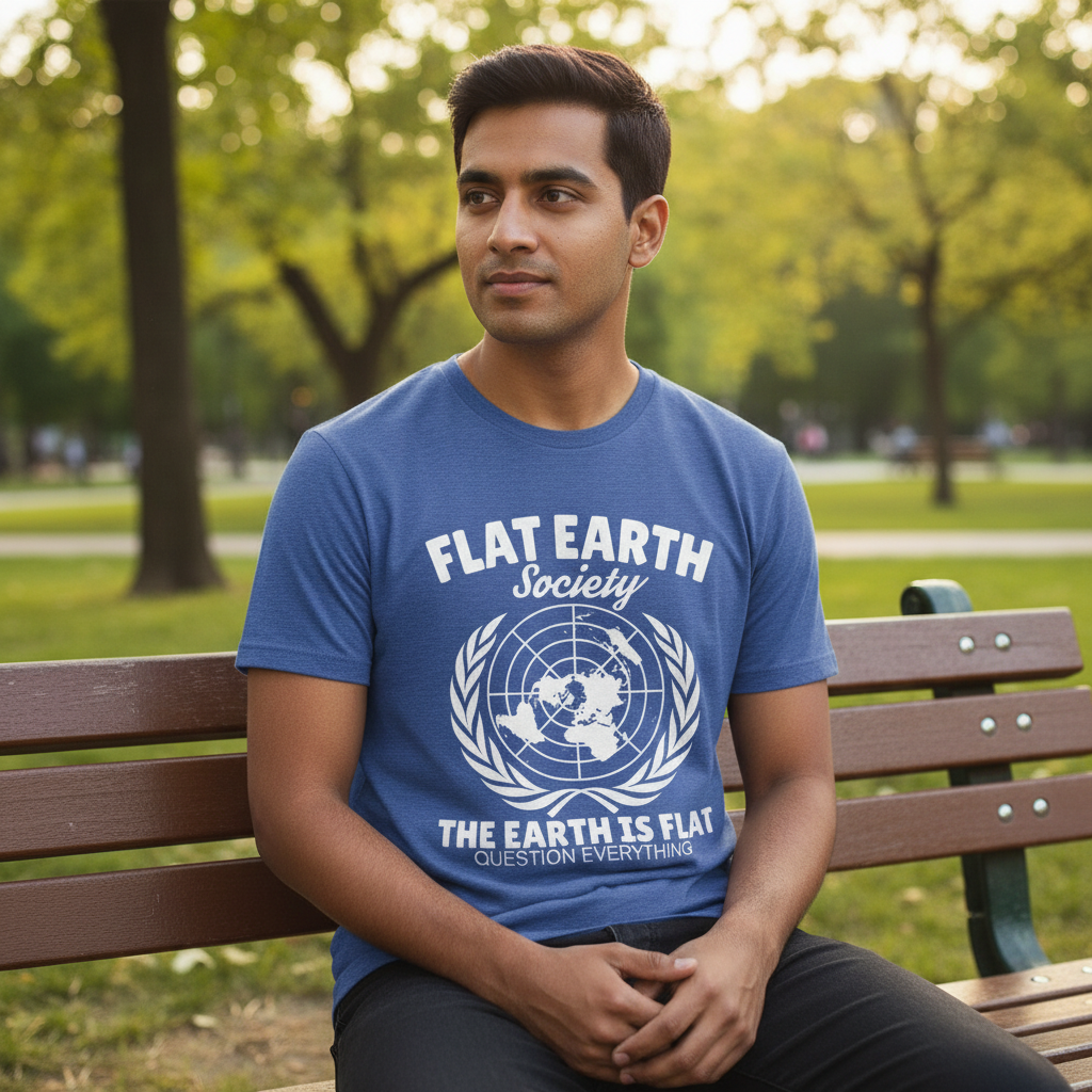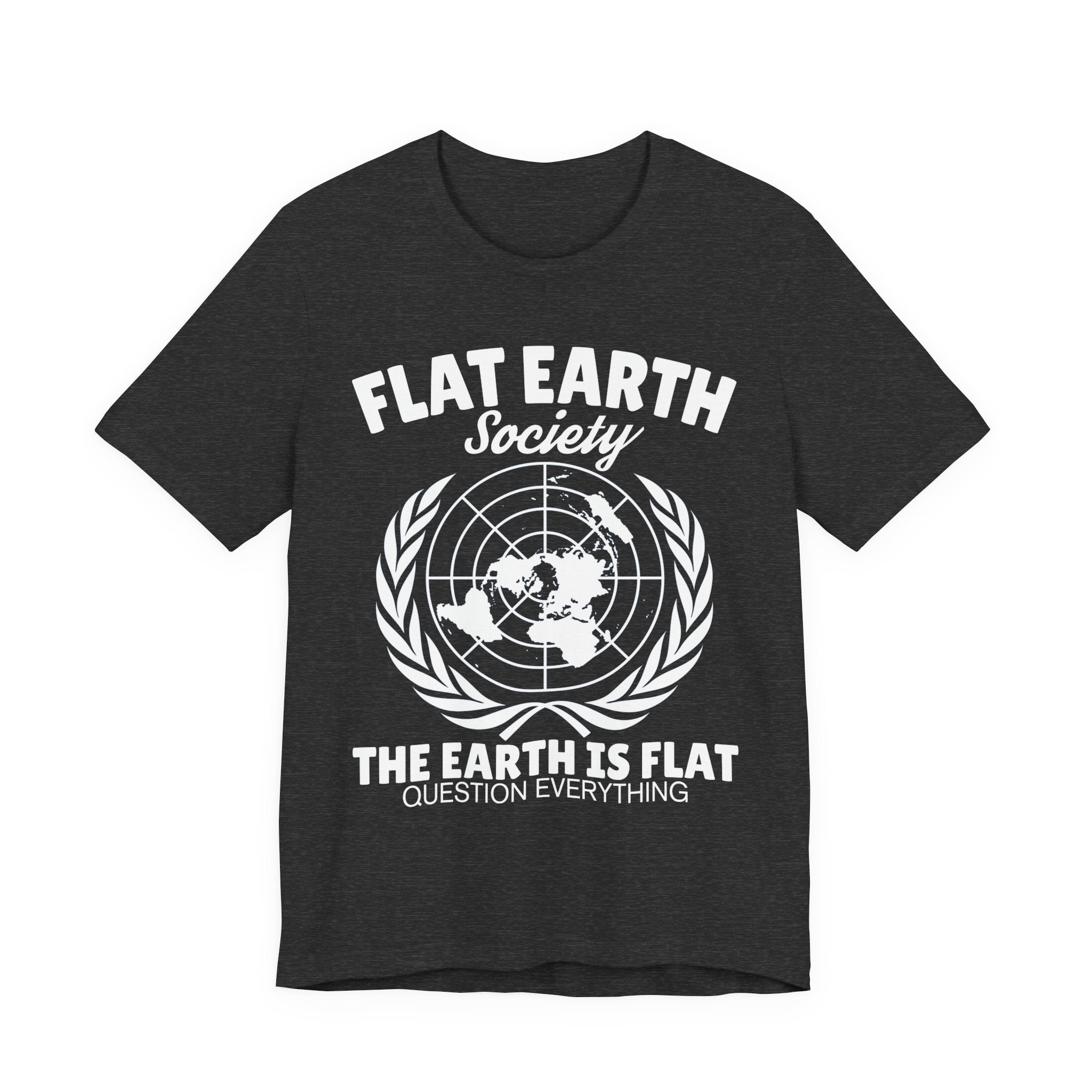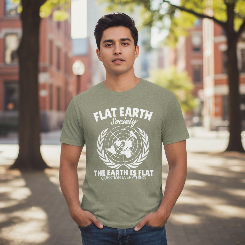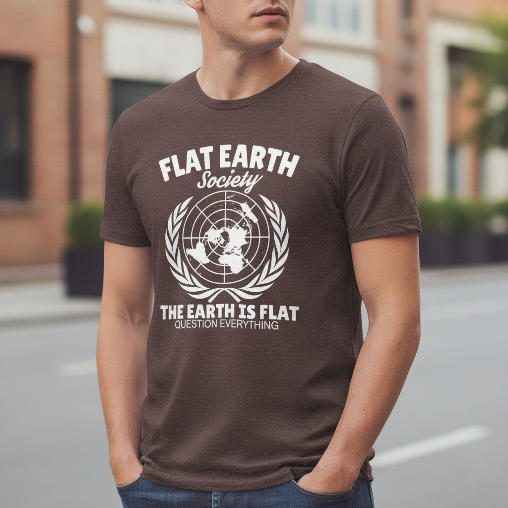 Lightweight, breathable tee that wears like a trusted favorite. This crew-neck shirt carries a bold, vintage-inspired Flat Earth Society emblem across the chest — a stylized globe framed by laurel leaves and the tagline “THE EARTH IS FLAT / QUESTION EVERYTHING.” The soft Airlume combed and ring-spun cotton feels refined against skin and layers cleanly under jackets or over long sleeves. Subtle heather texture gives the print a lived-in look, while durable side seams, ribbed collar, and shoulder tape keep the silhouette crisp through repeated wear. Ethically produced and REACH certified, this shirt balances a retro conspiratorial vibe with modern comfort.