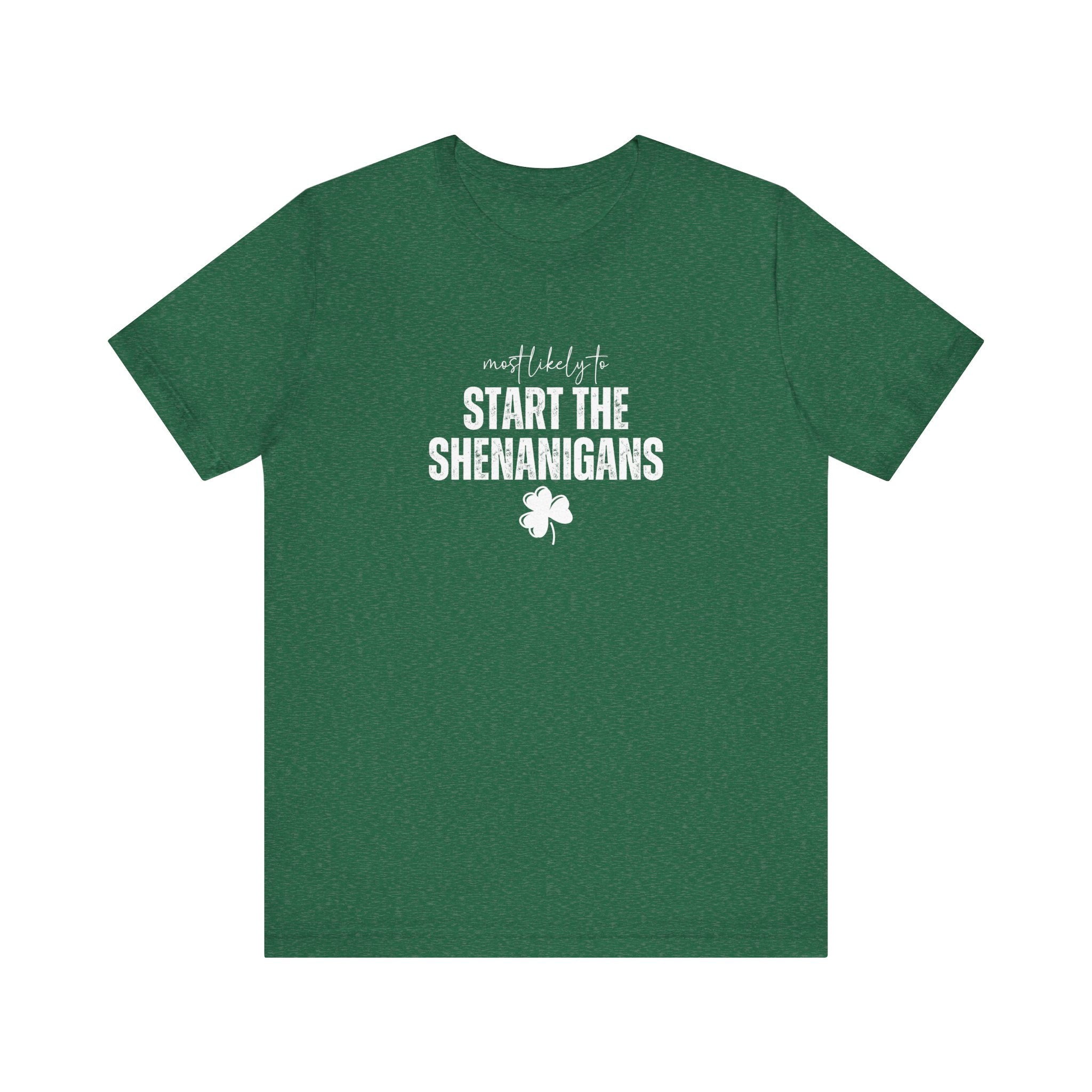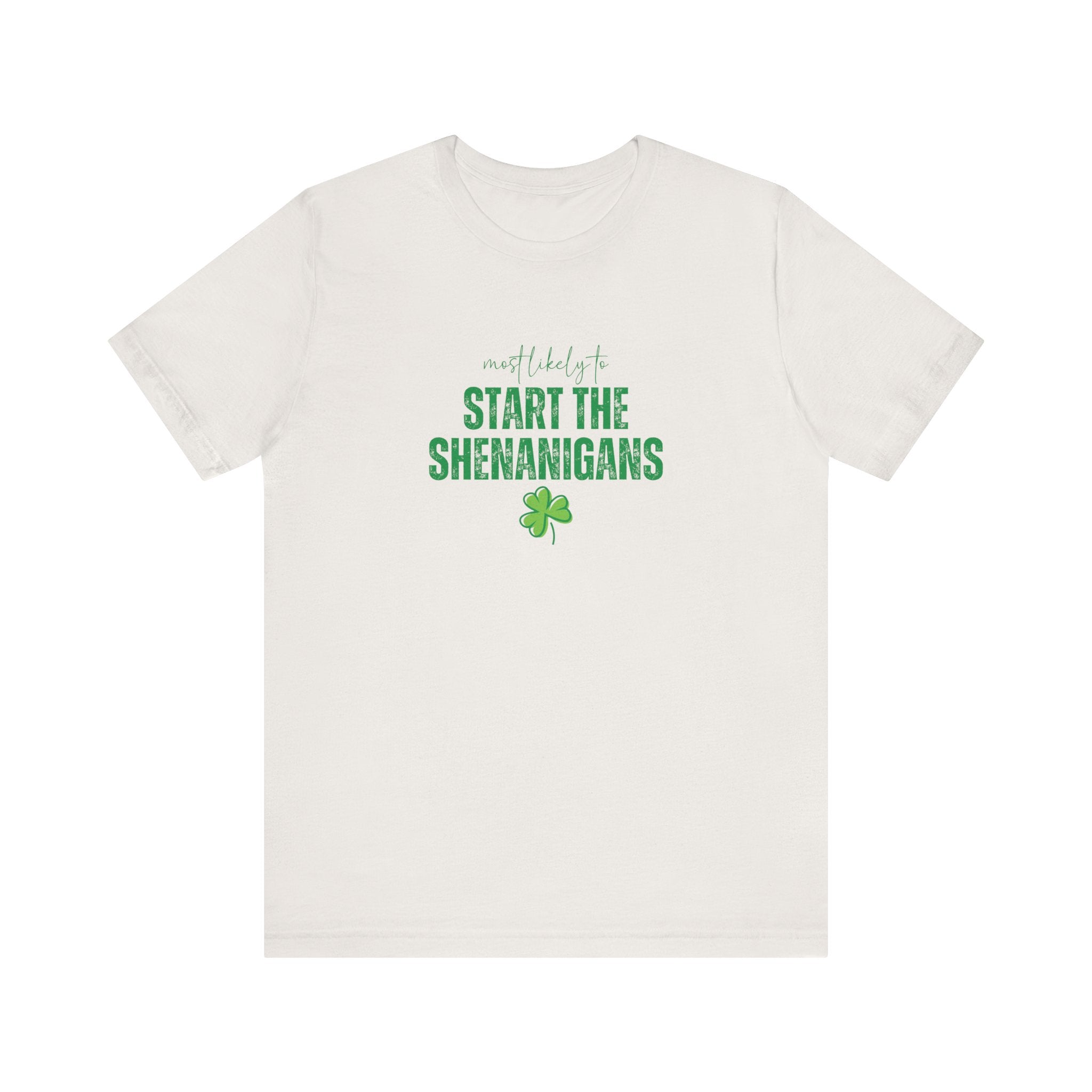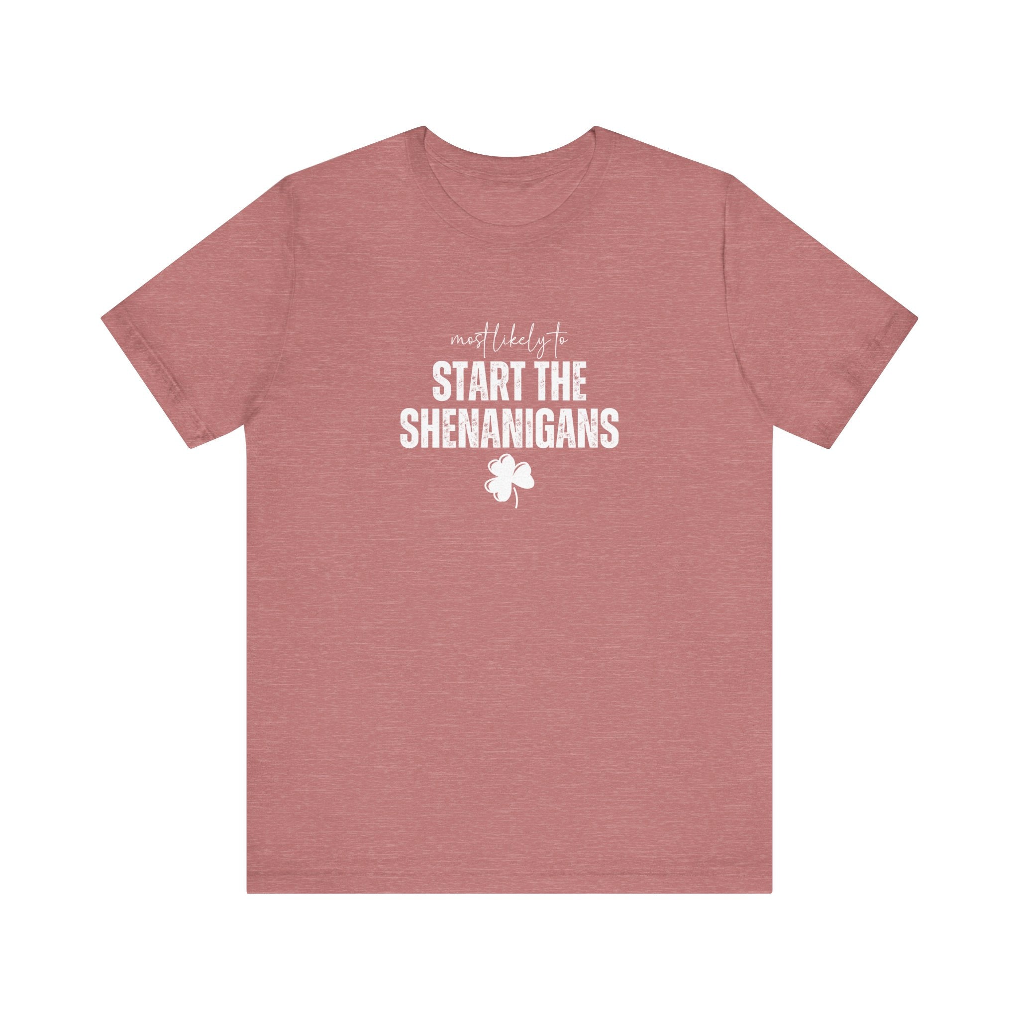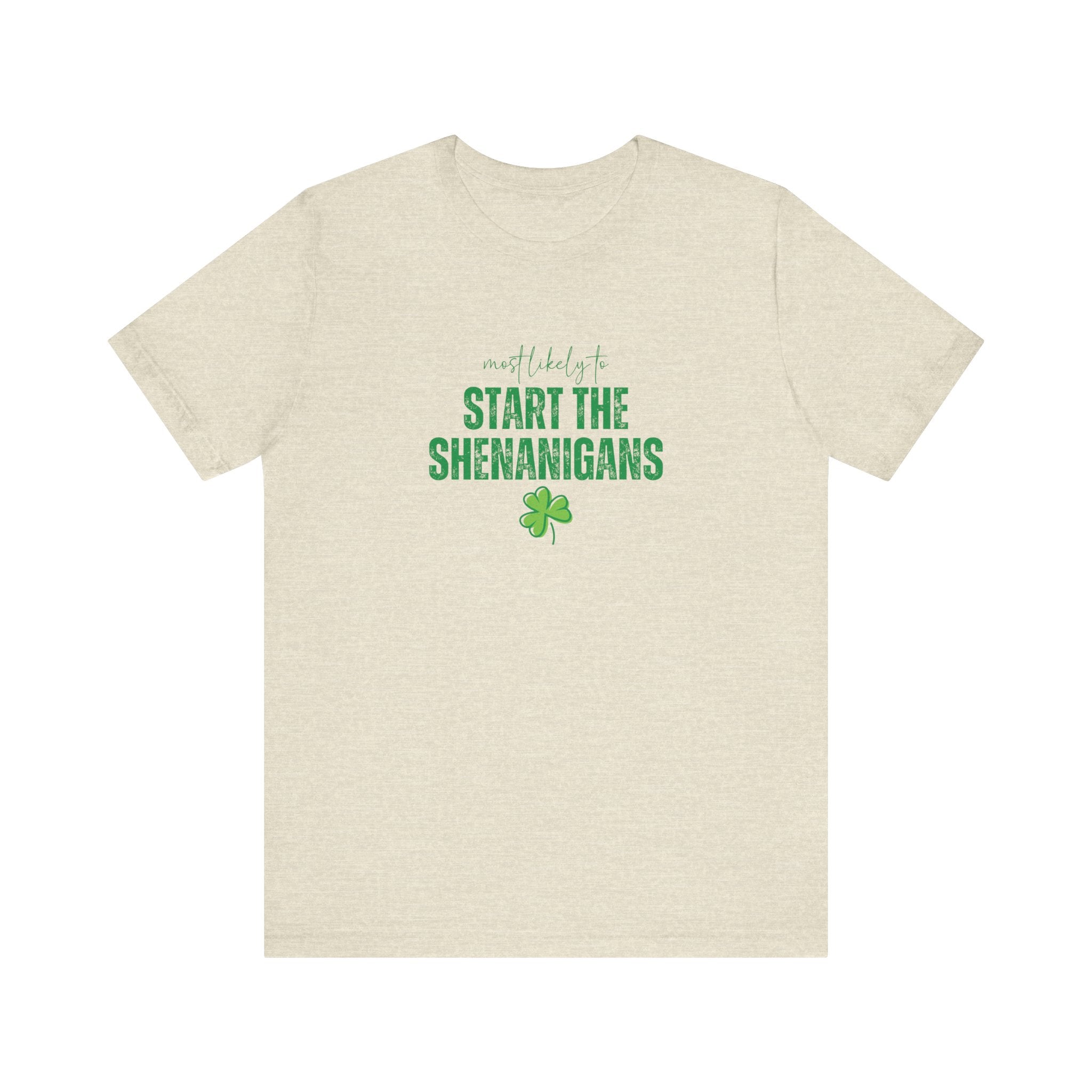 Light, soft, and effortlessly playful — this crewneck tee carries a cheeky, lucky charm energy. The centered white print reads “Start the Shenanigans” above a small shamrock, giving the shirt a lighthearted nod to mischief and celebration. Breathable Airlume combed ring-spun cotton keeps it comfortable for long days out or late-night gatherings. Subtle heather texture and a retail fit make it easy to layer under a jacket or wear solo as a statement piece. Thoughtfully finished details — side seams for shape, ribbed collar, shoulder tape, and a tear-away label — keep the tee feeling polished and easy on the skin. Ethically produced materials and REACH certification add quiet reassurance for conscious shoppers.