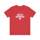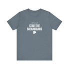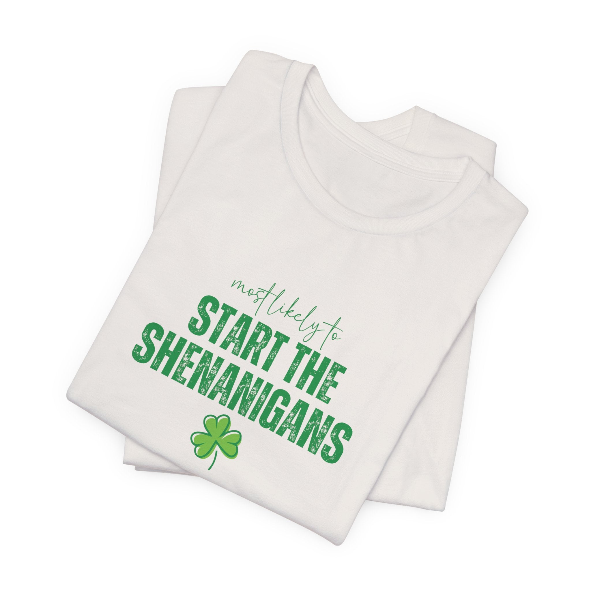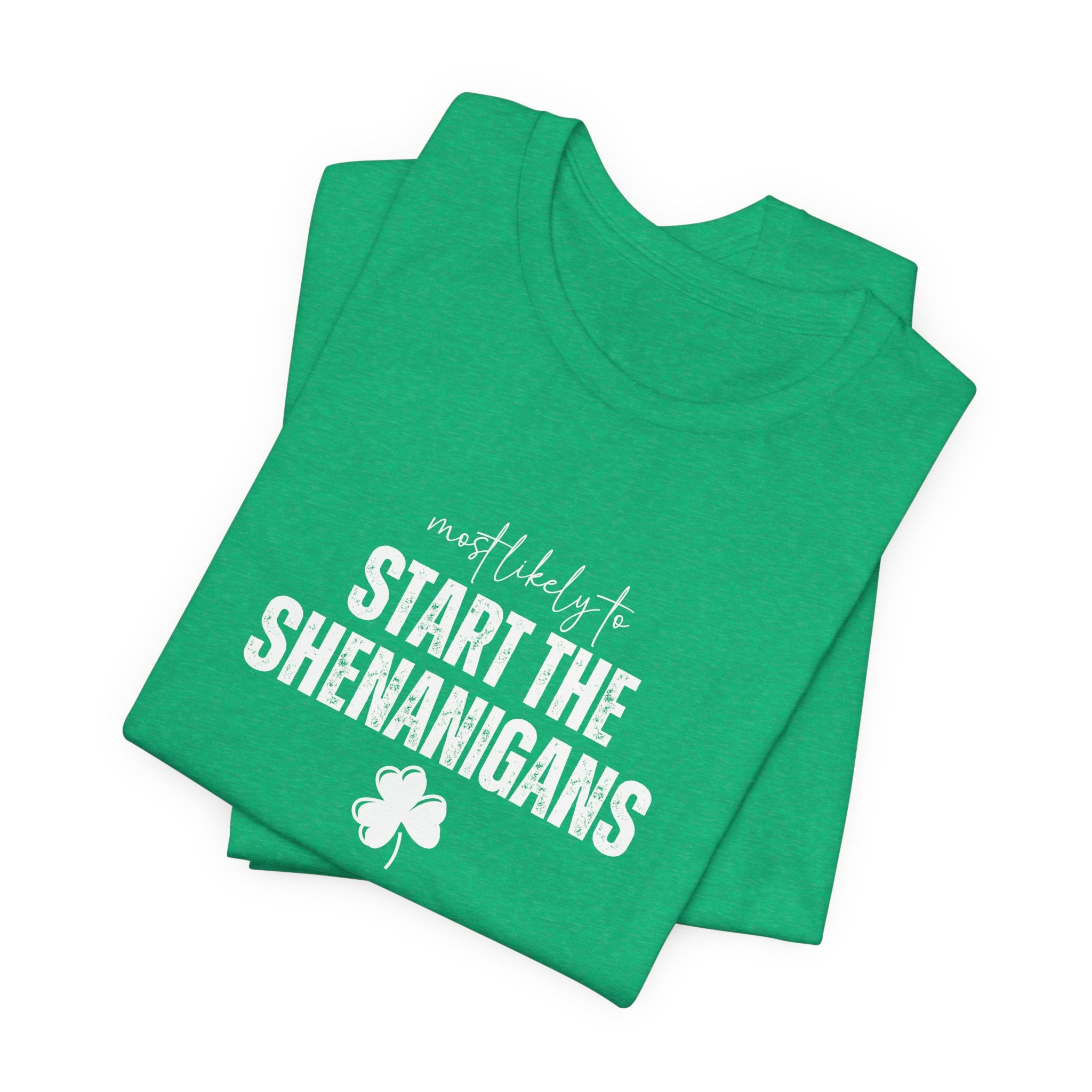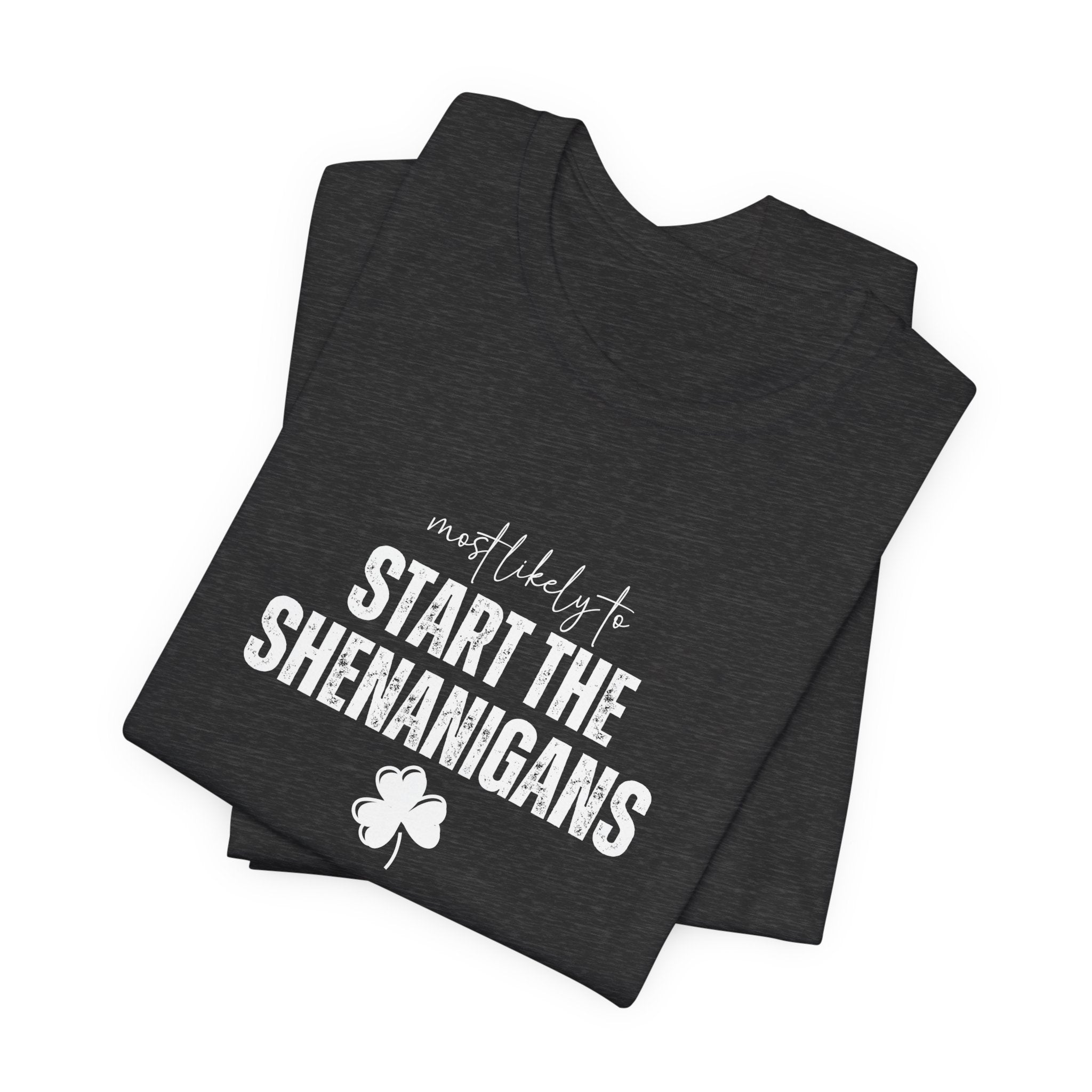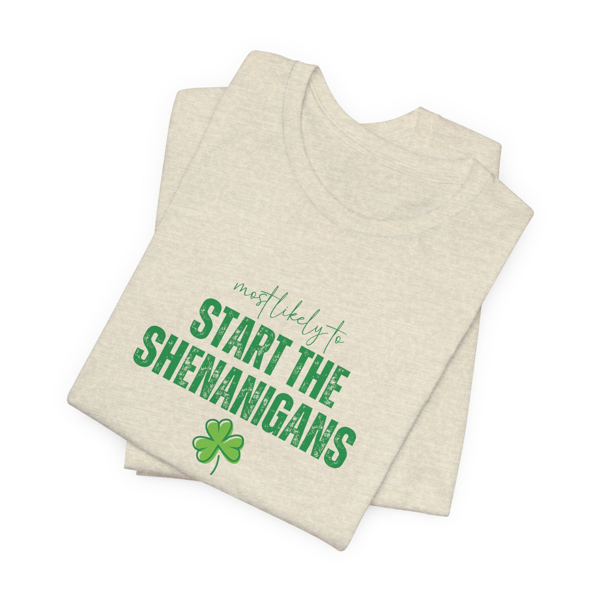 Light, soft, and effortlessly playful — this crewneck tee carries a cheeky, lucky charm energy. The centered white print reads “Start the Shenanigans” above a small shamrock, giving the shirt a lighthearted nod to mischief and celebration. Breathable Airlume combed ring-spun cotton keeps it comfortable for long days out or late-night gatherings. Subtle heather texture and a retail fit make it easy to layer under a jacket or wear solo as a statement piece. Thoughtfully finished details — side seams for shape, ribbed collar, shoulder tape, and a tear-away label — keep the tee feeling polished and easy on the skin. Ethically produced materials and REACH certification add quiet reassurance for conscious shoppers.