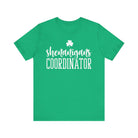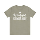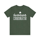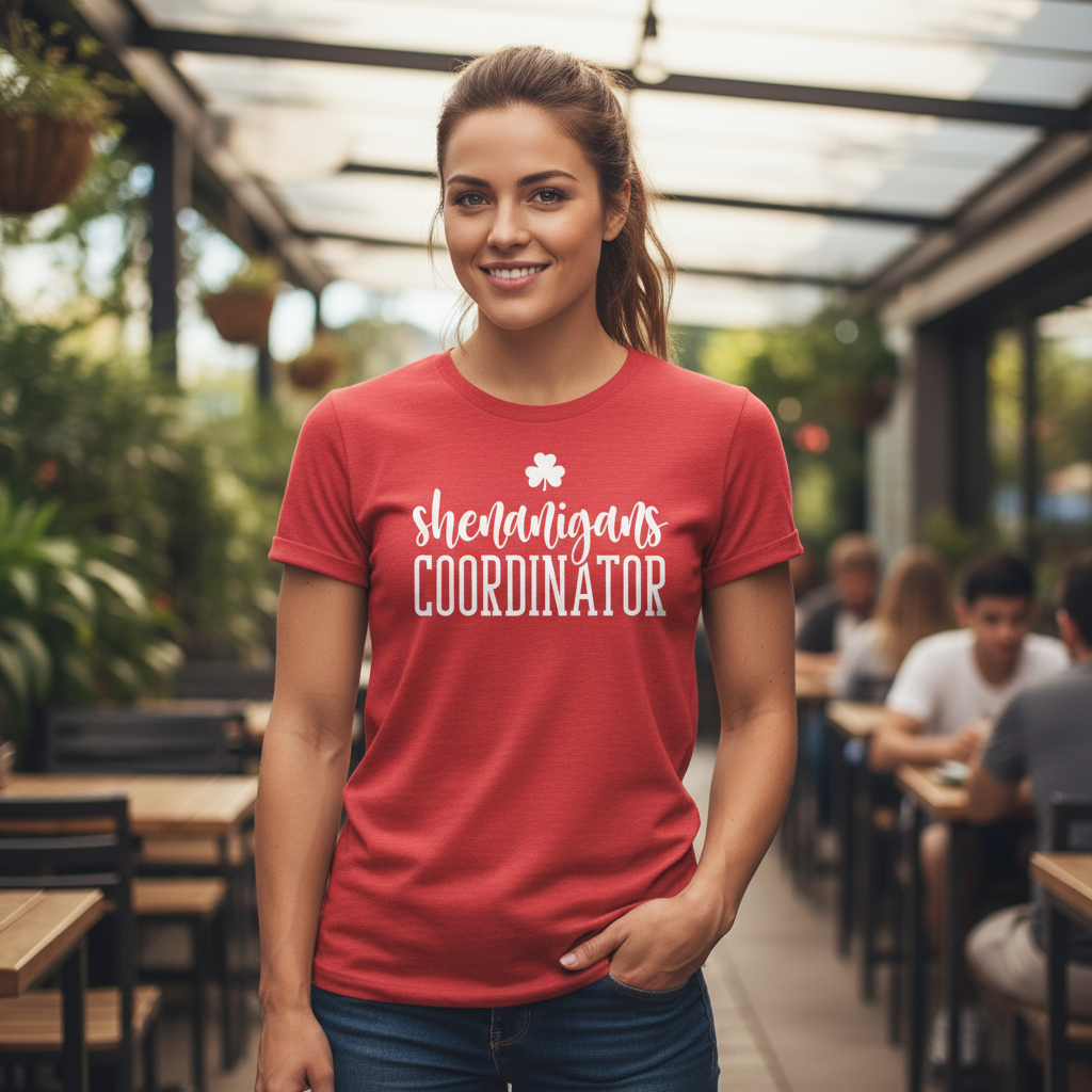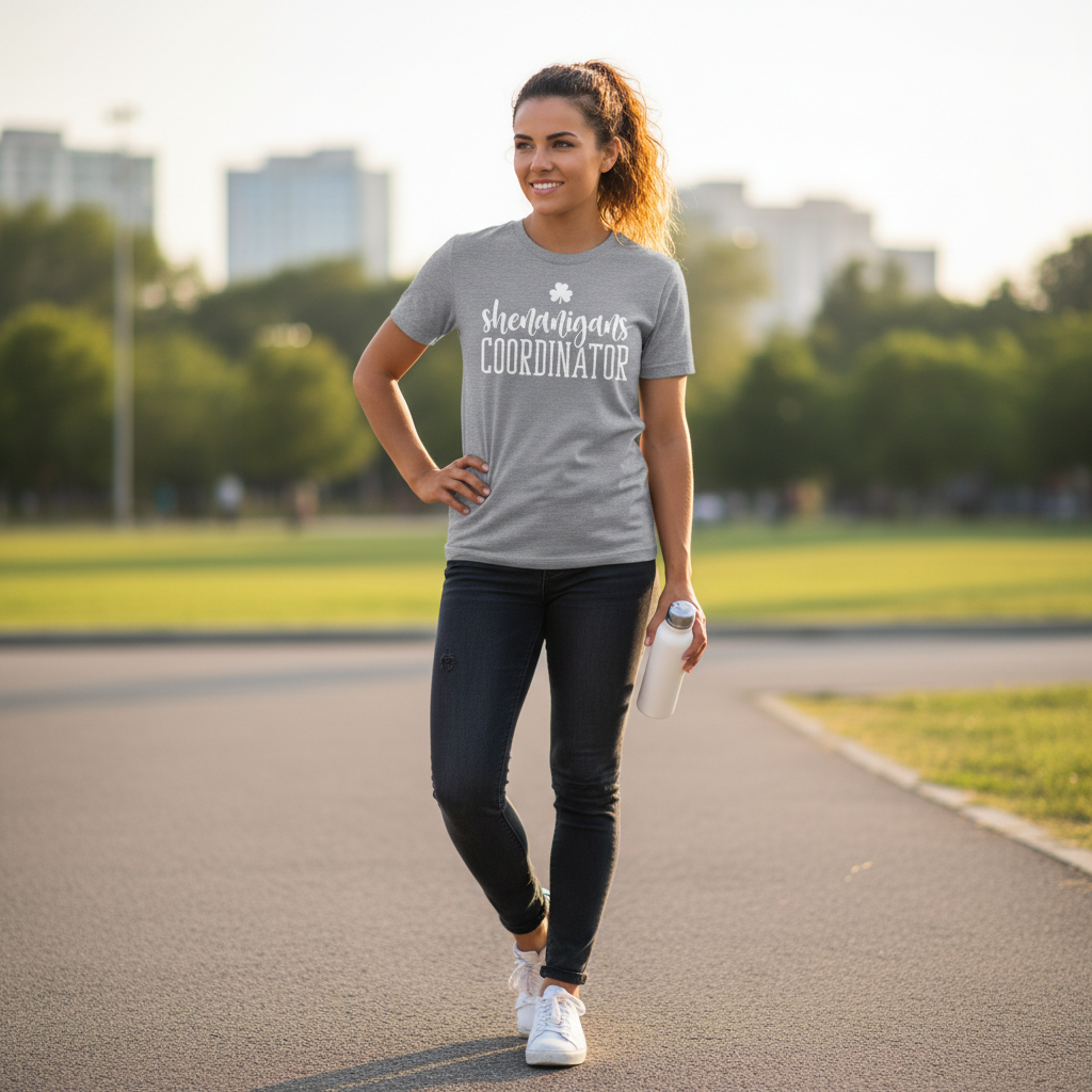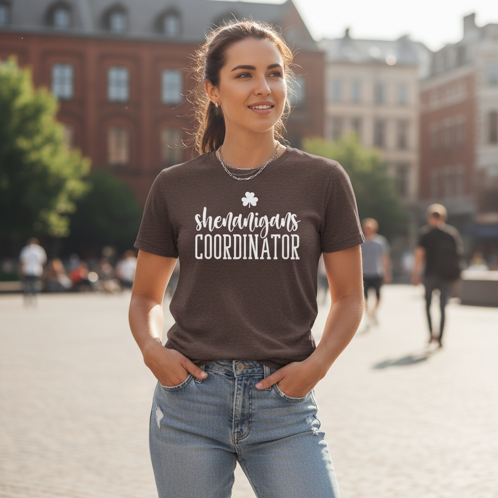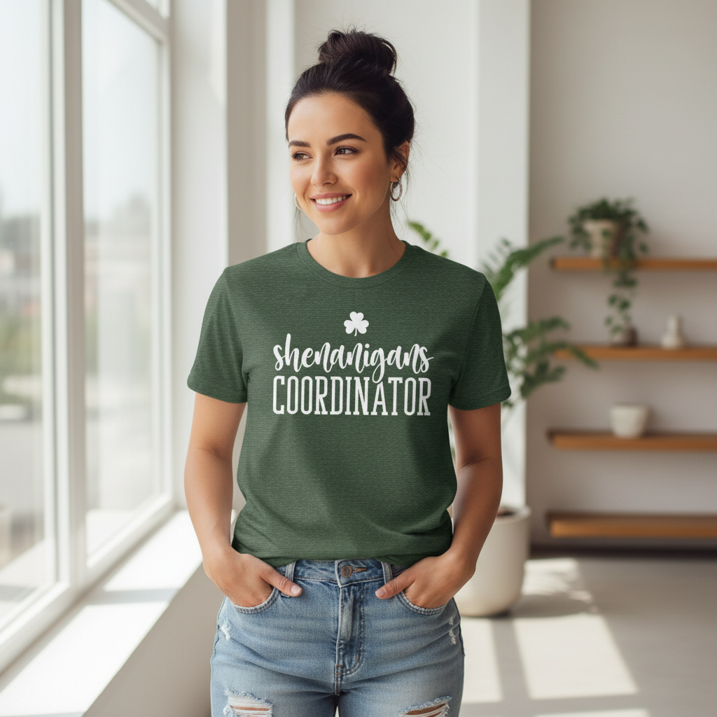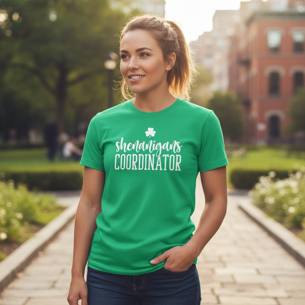 Soft, breathable, and casually confident — this short sleeve tee dresses up the person who organizes the fun. The lightweight Bella+Canvas fabric feels cool against the skin while the ribbed crew neck and shoulder tape keep the silhouette tidy after repeated wear. A playful “shenanigans coordinator” script and small clover sit bold across the chest in crisp printing that pops on heathered tones. Wear it to pre-party meetups, parade days, or relaxed pub crawls; it layers easily under a jacket or wears solo when you want to announce your role with humor. Ethically made blanks, tear-away labels, and durable side seams mean it’s built to be worn again and again.