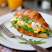 Vegetarian breakfast sandwich with egg frittata, goat cheese, fresh arugula, herby chimichurri sauce, on a house-made croissant bun