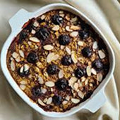 A baked oatmeal with tart and sweet cherries and toasted almonds, served with choice of milk