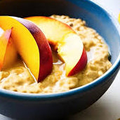 A wholesome oatmeal with house-made ginger peach compote, granola, and oat milk