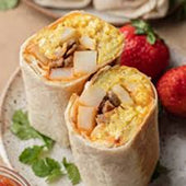Cage-free Yuppie Hill eggs, vegetarian sausage, Wisconsin smoked cheddar, roasted corn, red pepper, fresh jalapeños, onions, tortilla strips, served with house-made salsa